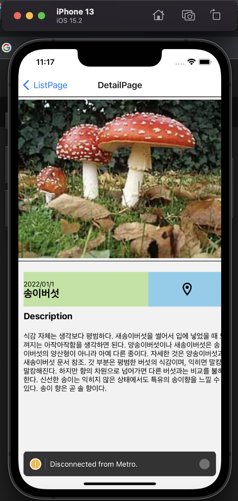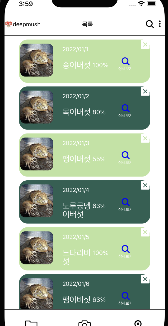 1주차에는 헤드이신 앤드류님의 스토리도 듣고 동기부여가 되는 많은 이야기들을 듣게 되었고 도커의 사용법 , 리액트가 무엇인지 , 엔진엑스가 무엇인지 백엔드 장고가 무엇인지 등등을 배웠다. 그리고 팀 주제를 사진을 찍어 올리면 AI로 버섯을 인식을하고 독버섯인지 먹을 수 있는 버섯인지를 구별해주는 프로젝트를 주제로 선정을 하였다 그리고 개발을 2주차부터인 이번주부터 시작을 하게 되었다. 현재 팀원들과 같이 깃크라켄을 이용해서 협업을 하고 있고 나는 react-native를 이용해 frontend를 담당해서 작업을 진행중이다 첫주에 figma와 zeplin을 이용해서 프론트엔드 UI를 구상하고 만들었다 그리고 이번주 첫날인 월요일에는 로그인페이지를 만들었고 화요일에는 expo-camera를 이용한 카메라 페이지를 만들었고 수요일에는 Flatlist를 이용해서 버섯리스트 화면을 만들었다. 그리고 목요일에는 버섯설명상세페이지를 만들었다. 이 프로그램을 하면서 1주차밖에 지나지 않았지만 백엔드와 프론트엔드의 개념을 정확하게 이해하게 되었고 협업을 하는 방법들과 다양한 툴들을 이용하는 방법들을 배우고있다. 정말 끝나고 나면 다른 사람들이 가지지 못한 엄청난 무기를 손에 쥘거라고 생각을 한다.