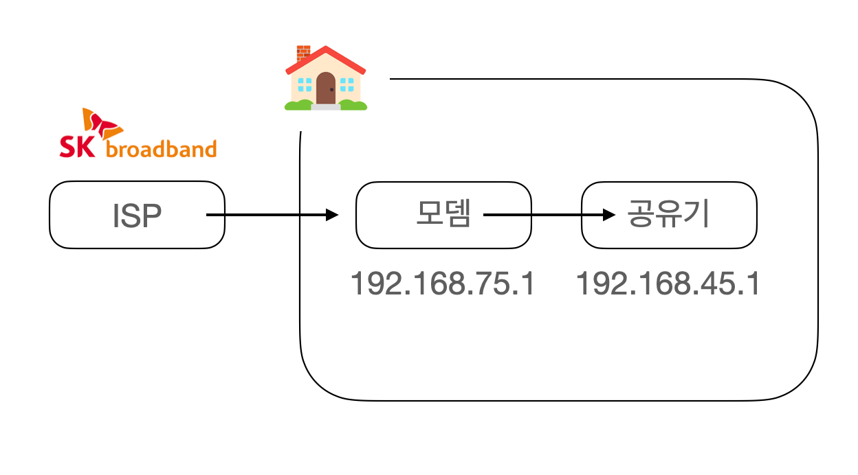 외부 인터넷 선에서 모뎀으로 연결되고 모뎀에서 공유기로 연결되어 있는 상황이다. 그리고 SKT의 인터넷은 모뎀과 공유기 모두 각각 NAT 방식으로 설정이 되어있다.