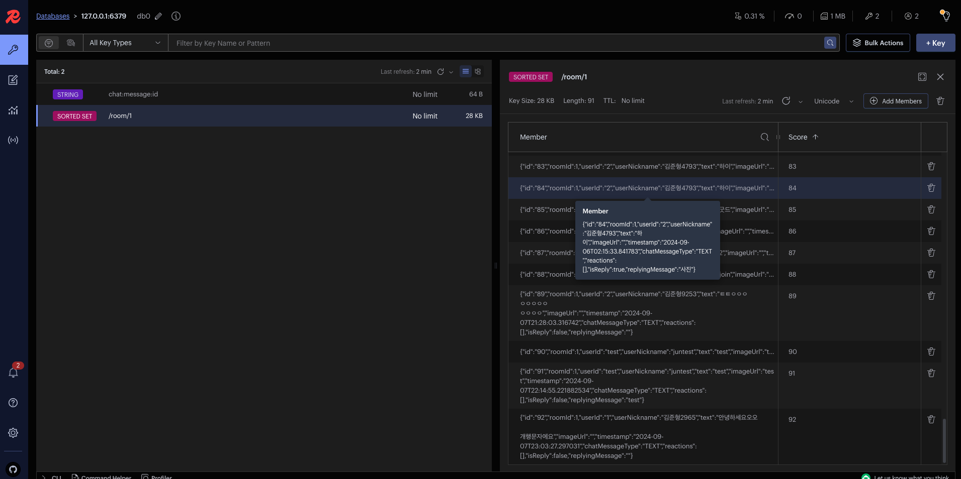 이 과정에서 자연스럽게 각 계층 간 전송을 위한 메세지의 직렬화와 역직렬화가 이루어지다가 최종적으로 redis에는 다음과 같은 문자열(json) 형태로 직렬화된 데이터가 저장이 된다.