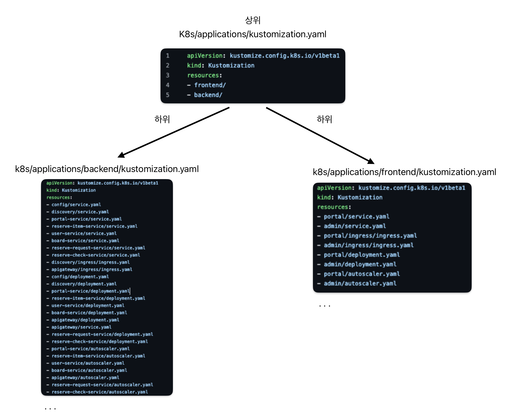 각각의 kustomization.yaml 파일은 애플리케이션의 다양한 계층 또는 구성 요소를 관리합니다. 아래는 applications 디렉터리의 예시입니다: