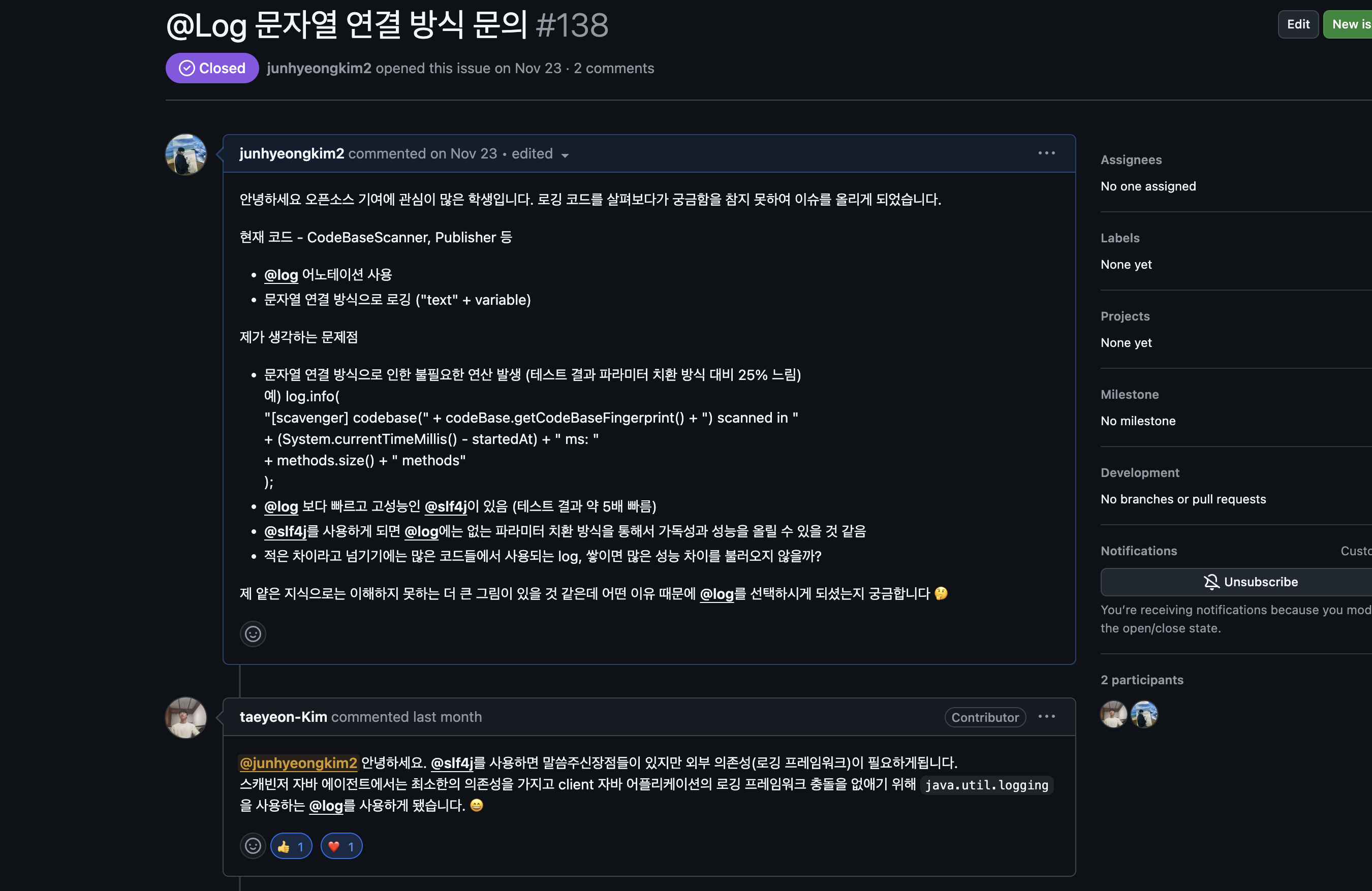 @Slf4j 로깅 뿐만 아니라 @Log를 활용한 로깅에 대해서 알게 되었고 둘의 로그 레벨의 차이에 대한 점을 알게 되었습니다. 또한 문자열 연결 방식 로깅의 동작 과정과 파라미터 치환 방식 로깅의 동작 과정에 대해서 알게 되었습니다. 그리고 둘의 성능 차이에 대해서 알게 되었습니다. 비록 리팩토링을 하고 PR을 올리는 것까지 이어지지는 못했지만 오픈소스 코드들을 들여다보고 분석을 하기 시작하면서 좋은 코드란 무엇인가?에 대한 기준이 조금씩 생기고 있는 것 같습니다.