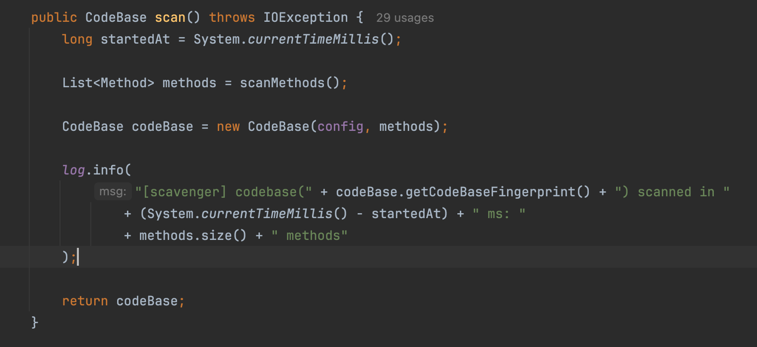log.info("[scavenger] codebase({}) scanned in {} ms: {} methods",