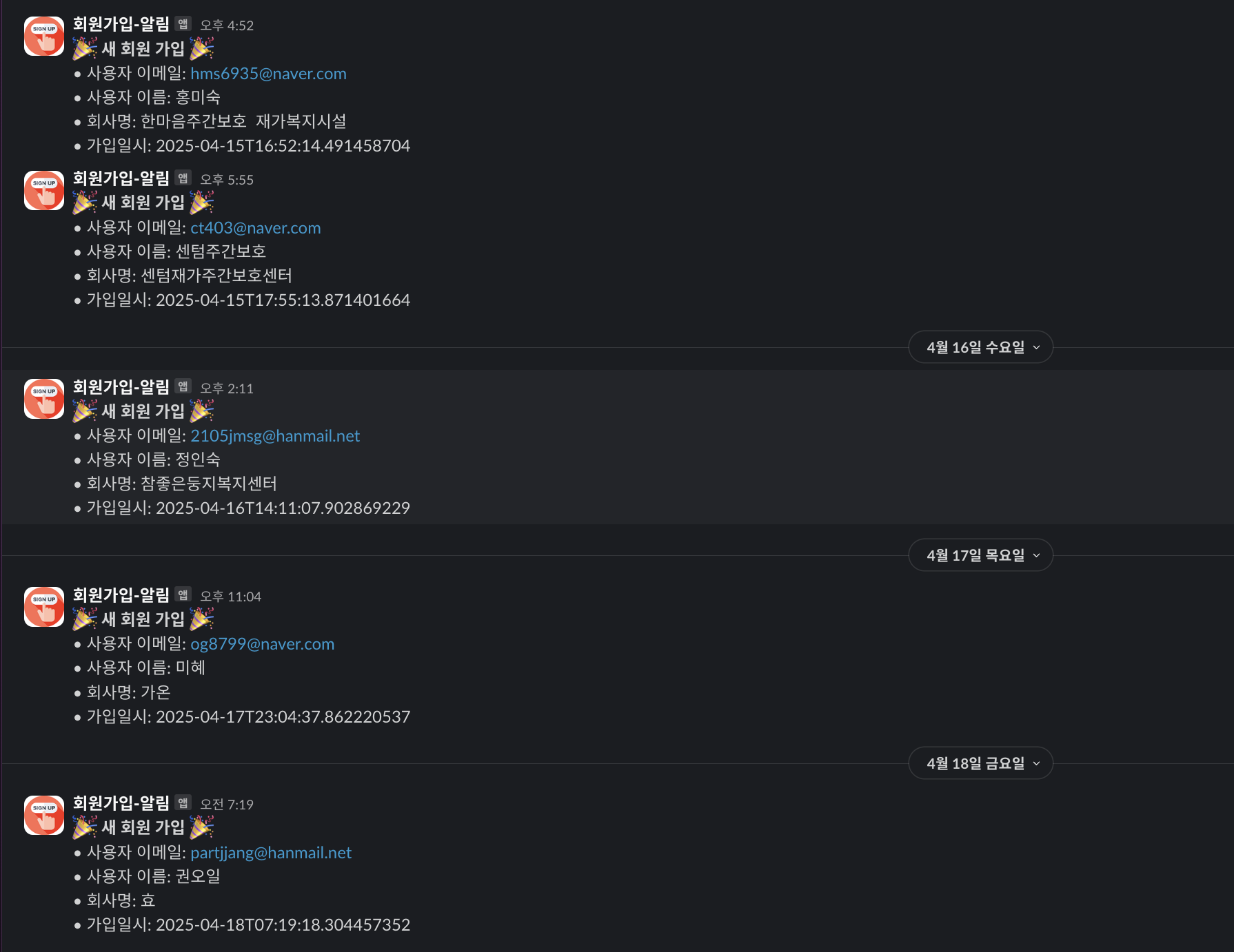 서울, 인천, 창원, 강원도 등 전국 곳곳에서 회원가입이 있었습니다.