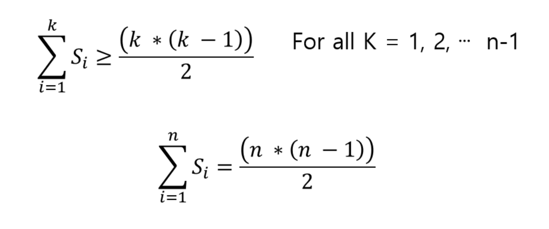 Graph의 노드에 대한 Degree를 오름차순으로 (s1,s2,...sn)으로 정렬했을 때, 다음과 같은 두 성질을 만족한다면, Tournament Graph이다.