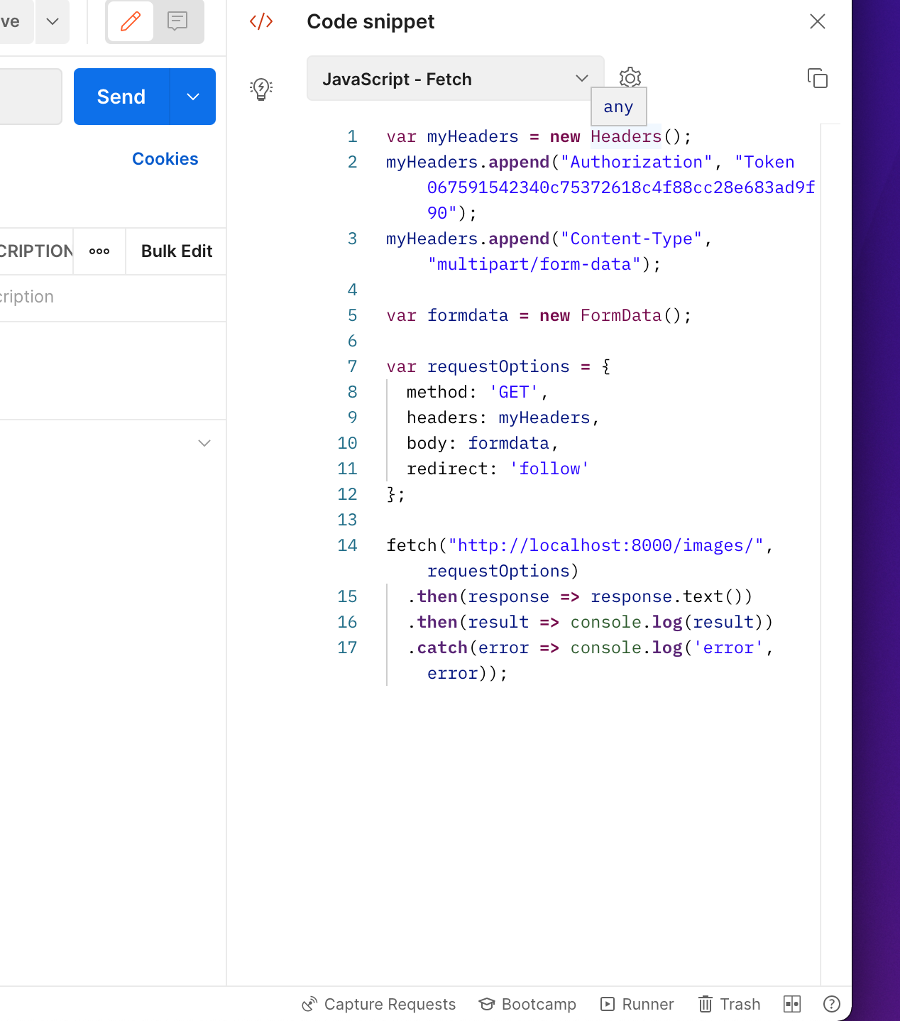 401에러가 났던 이유는 jwt 토큰을 사용해서 프로젝트를 진행하는데 authorization header에 jwt 토큰이 첨부가 되지 않아서 401에러가 계속 났다. 그래서 이유를 찾다가 헤더에 credential으로 include를 해주니 401 에러는 해결이 되었다 .그러나 그다음부터는 500에러가 떴다 이 에러가 왜 나는지 찾아보다가 postman에서는 image를 실어서 post를 주면 문제없이 리스폰스를 받는것을 확인하였다 . 그래서 react에서의 코드를 수정을 하기 시작했다. 처음에는 axios 다음으로는 fetch를 써가면서 포스트 요청을 했지만 계속해서 500 에러가 떴다 .결국 방법을 찾다가 postman에서 api 요청을 자동으로 여러 언어에 맞게 바꿔주는 기능이 있었다.