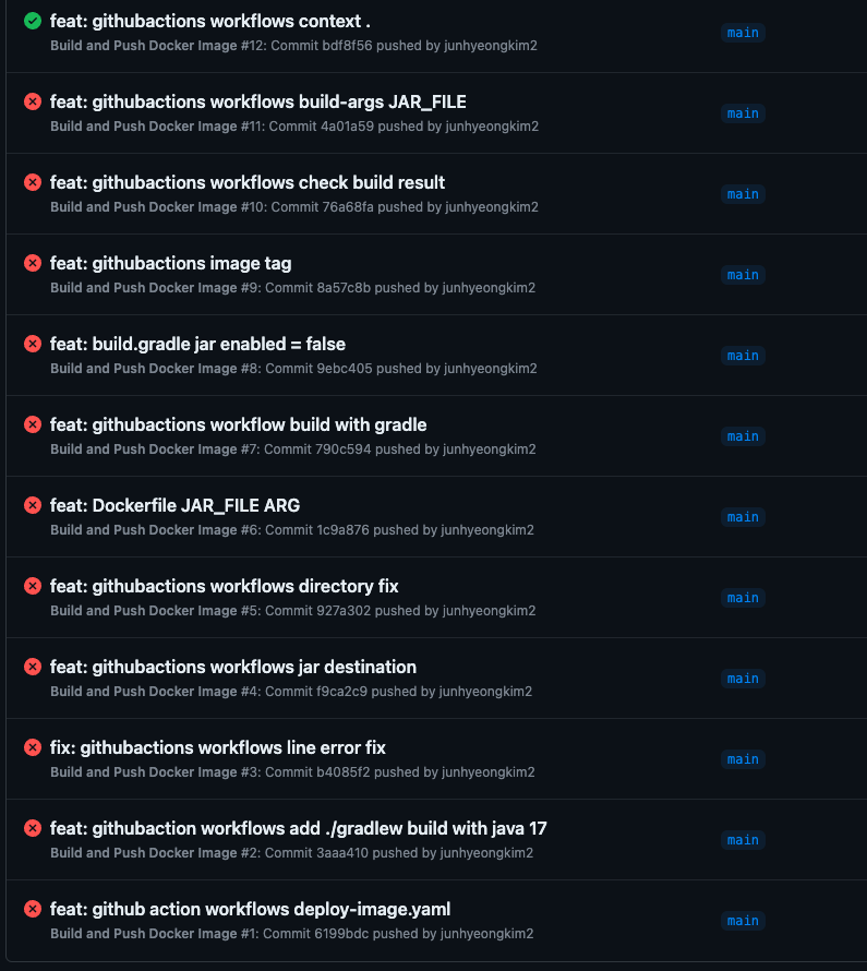 괜히 worflows.yaml의 들여쓰기도 고쳐보고 도커파일도 수정해보고 경로도 수정해보고 시도를 하였지만 모두 실패