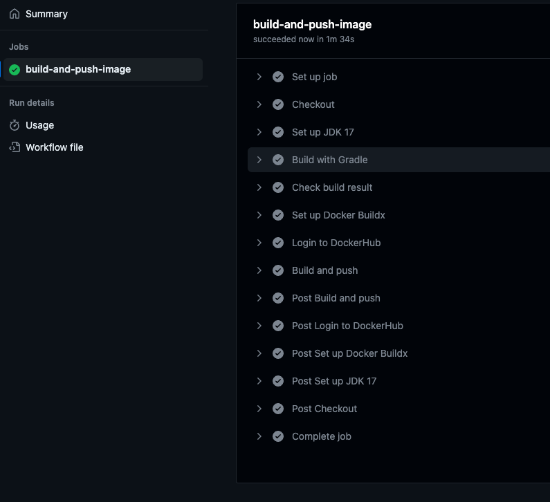 그러다가 스프링부트 프로젝트를 빌드를 할 때의 폴더는 현재 폴더 경로의 build/libs인데 도커를 빌드 할 때에는 /tmp/buildkit-mount... 이라는 폴더에서 build/libs를 찾는것을 보았고 이 /tmp/buildkit이라는 폴더가 어떤 것인지 찾아보았다. 결국에는 이 폴더가 도커를 빌드할때 임시로 만들어지는 공간이라는것을 알았고 이 차이 때문에 build/libs를 못 찾고 있다는 것을 알게 되었다. 그래서 결국 도커 빌드를 하는 job의 폴더 위치를 context를 이용하여 gradlew build가 된 위치와 동일한 현재 경로를 설정해 주었더니 드디어 workflow가 성공할 수 있었다.