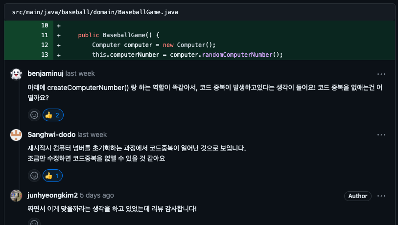 3. 처음으로 코드에 대한 리뷰를 주고 받았습니다.